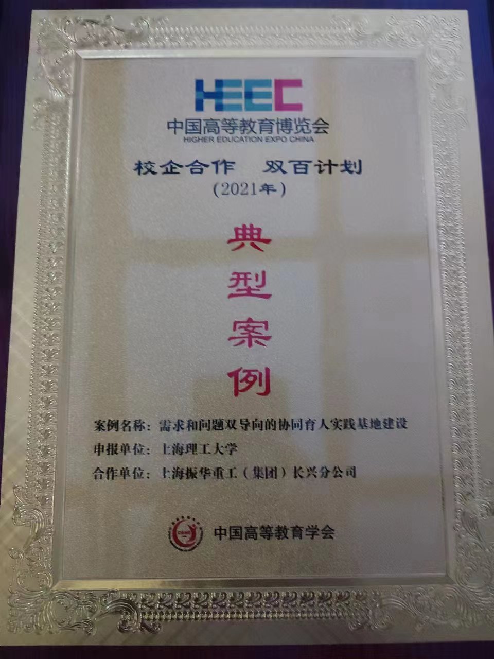 From August 4 to 6, the Chinese society of Higher Education held the "Sixth Conference on integrated development of industry and education" in Xi'an, Shaanxi Province, which is a part of the 57th China Higher Education Expo. At the meeting, the project of "Demand and problem oriented collaborative education practice base construction" jointly declared by our College and the cooperative unit Shanghai Zhenhua heavy industry (Group) Changxing branch was awarded the "Typical case of school enterprise cooperation double hundred plan (2021)" by China Higher Education Association.