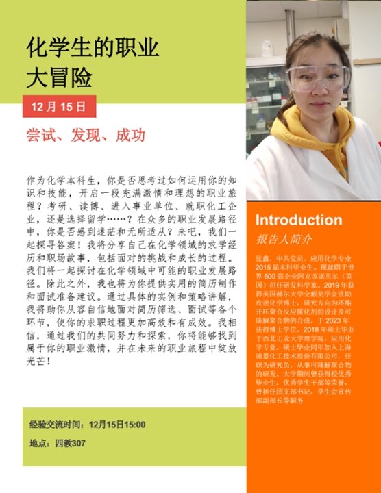In 2015, Zhang Xin received her bachelor’s degree in Applied Chemistry from the University of Shanghai for Science and Technology. She recently completed her PhD program at the University of Hull and is currently employed as an R&D scientist at AlkzoNobel in England.On December 15, she was invited to share her inspiring stories and valuable experiences with students. During the conversation, she encouraged all attendees to face failure bravely, work hard, set clear life goals, remain dedicated to their initial aspirations, and recognize the value of life. Additionally, she provided valuable advice to students, urging them to put down their cellphones, seize opportunities, study diligently to surpass their own limitations, and strive to become the best and most outstanding individuals. She expressed her belief that students should not limit themselves and that as long as they are willing to embrace new experiences, they will find success.Furthermore, Zhang expressed her strong desire to establish collaborations in research and education with her Alma mater, the University of Shanghai for Science and Technology, in the near future. She hopes to contribute to the international development of the university.This talk exemplifies the influential and guiding role that exceptional alumni play in shaping culture, academia, and ideology. It broadens students’ perspectives and stimulates their enthusiasm for learning. We firmly believe that the power of leading by example can inspire students to work diligently and make the most of their youth.