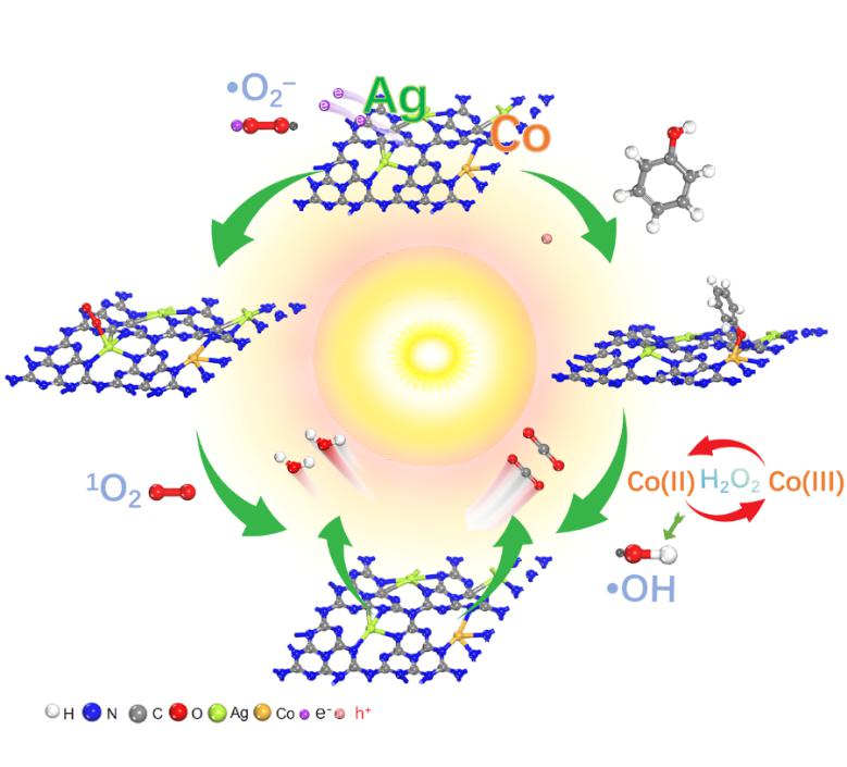 Constructing a photo-Fenton catalytic reaction by in situ generation of H2O2 provides an effective pathway for pollutant treatment. To this end, Lian Zichao et al. proposed an efficient photo-self-Fenton reaction for the degradation of pollutants using high-density (Ag: 22 wt.%) atomically dispersed AgCo bisites embedded in graphitic phase carbon nitride (AgCo-CN) photocatalysts. As shown in Fig. 1, the Ag and Co double sites in AgCo-CN play key roles in accelerating the light-induced charge separation and the formation of self-Fenton redox centers, respectively, and AgCo-CN possesses an effective degradation pathway, and the synergistic effect of reactive oxygen species (-OH and 1O2) achieves the complete mineralization of phenol, and the AgCo-CN exhibits excellent photocatalytic degradation performance and long-term activity . This study lays the foundation for the design of efficient photocatalysts for photoautofenton reaction, which is important for the development of new wastewater treatment methods.