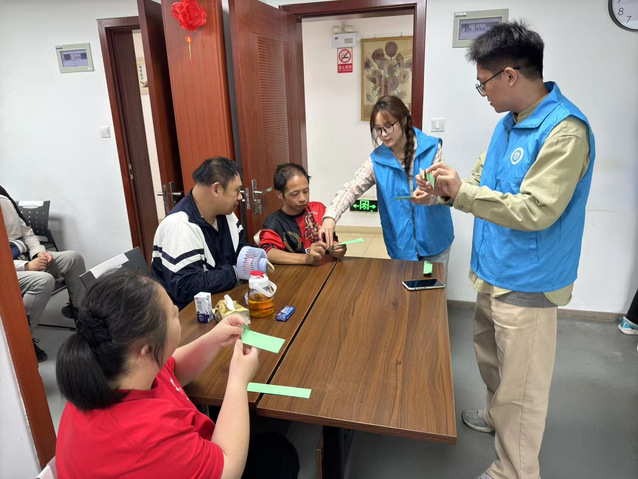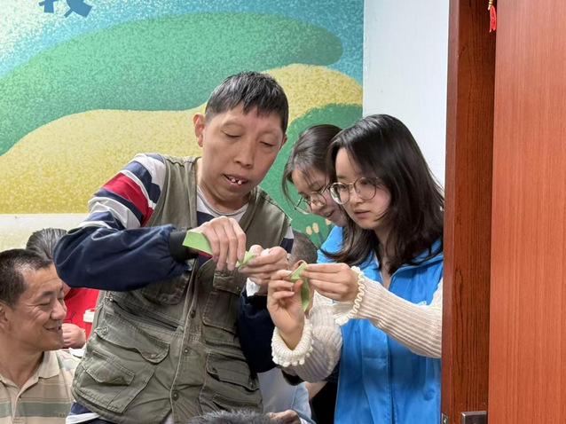 The Dragon Boat Festival is one of China's traditional holidays, and making zongzi (sticky rice dumplings) is a key custom. At the event, volunteers demonstrated traditional wrapping techniques for triangular and pyramidal (four-cornered) zongzi in small groups. Volunteer Wang even innovatively designed an anti-slip tying technique to help residents with limited hand mobility complete the task successfully. One resident with hearing impairments, with volunteer assistance, wrapped her first handmade zongzi and signed her appreciation, expressing how touched she was by the beauty of traditional culture.
