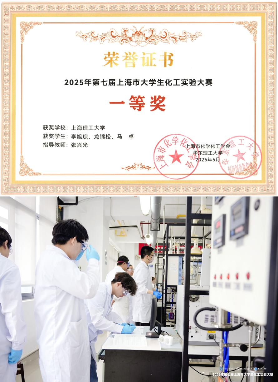 The National University Students' Chemical Engineering Experiment Competition is sponsored by the China Chemical Industry Education Association. It has been included in the competition catalog of the *2024 National Analysis Report on College Students' Competitions*, ranking 61st out of 84. As of the end of August 2025, it has been successfully held for eight sessions. With the purpose of implementing the spirit of the National Education Conference, the competition is committed to promoting the construction of "Emerging Engineering Education" for chemical engineering-related majors in colleges and universities, improving the teaching quality of core courses for undergraduate chemical engineering majors, and enhancing the ability of higher education to serve the development of the national economy. The student team "Huaqi Xinghe, Gongyun Liufang", composed of Li Xucong, Long Jinsong and Ma Zhuo (undergraduates of the Applied Chemistry major, Class of 2022 from the School of Materials and Chemistry), won the first prize in the Shanghai Regional Competition under the guidance of teachers including Zhang Xingguang from our school. Later, the team represented our university in the East China Regional Competition held at Nanchang University. This marks the first time that undergraduate students from our university have participated in this competition and won a Shanghai municipal-level award. It fully demonstrates the solid theoretical foundation and operational skills of the undergraduate students majoring in Applied Chemistry at our university, the achievements made in the construction of the Applied Chemistry major, as well as the talent cultivation concept of "student-oriented". This achievement has greatly stimulated the students' interest and enthusiasm in learning.